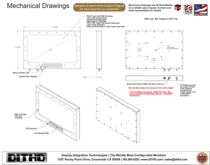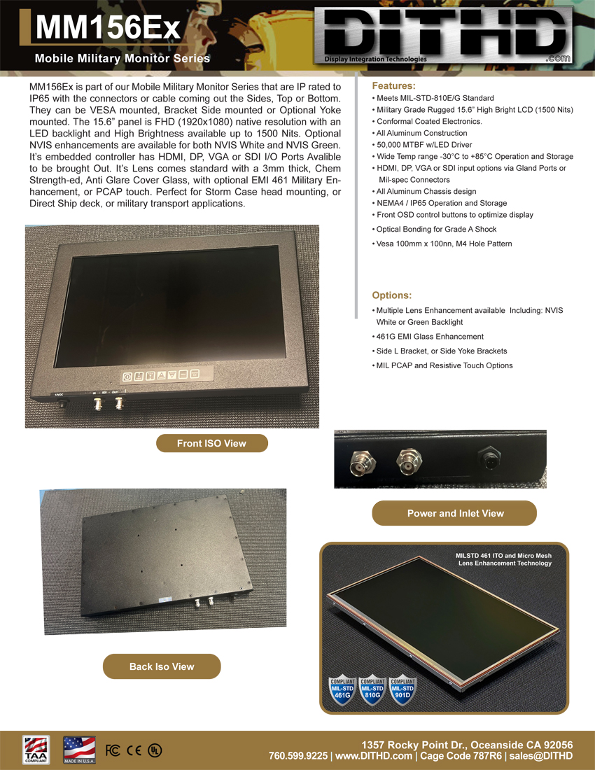 MM156Ex is part of our Mobile Military Monitor Series that are IP rated to IP65 with the connectors or cable coming out the Sides, Top or Bottom. They can be VESA mounted, Bracket Side mounted or Optional Yoke mounted. The 15.6” panel is FHD (1920×1080) native resolution with an LED backlight and High Brightness available up to 1500 Nits. Optional NVIS enhancements are available for both NVIS White and NVIS Green. It’s embedded controller has HDMI, DP, VGA or SDI I/O Ports Avalible to be brought Out. It’s Lens comes standard with a 3mm thick, Chem Strength-ed, Anti Glare Cover Glass, with optional EMI 461 Military Enhancement, or PCAP touch. Perfect for Storm Case head mounting, or Direct Ship deck, or military transport applications.
