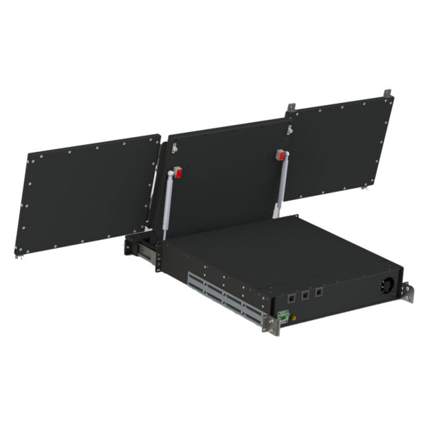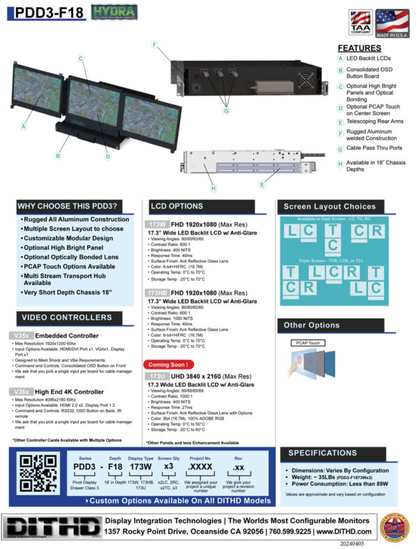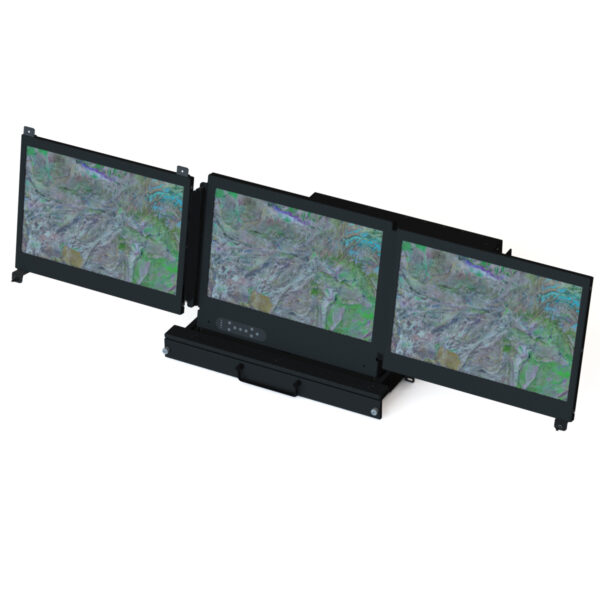 The PDD3-F18xx is a rugged 2U, 18” depth HYDRA Multi-Head Rack or Transit case platform which can support two, or three 17.3” LCD Panels (depending on your configuration). It offers our shortest Depth Hydra Solution with touch screens and panel enhancement options. It comes standard with gas shock stabilizers, telescoping rear arms, and MIL Standard C300 friction slides. Its rugged modular design makes the PDD3-F18 perfect for mobile or transit case applications.